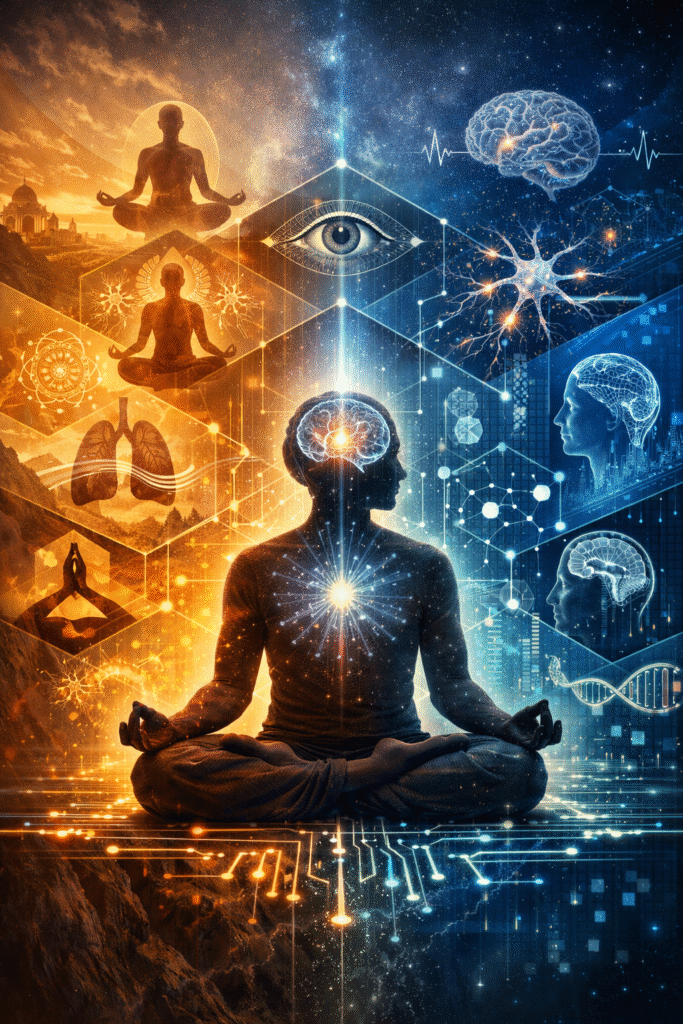 Abstract Yoga is commonly misunderstood as either a physical exercise system or a spiritual belief tradition. Classical yogic literature, however, presents yoga as something far more precise: a structured technology for mental transformation. Rooted in the psychological framework of the Yoga Sūtra and the metaphysical clarity of Sāṃkhya philosophy, yoga was designed to systematically modify cognition, emotional reactivity, attention, and perception. This article explores yoga as an inner technology—a deliberate, step-by-step system that trains the mind using specific tools such as ethical regulation, posture, breath control, sensory withdrawal, concentration, meditation, and absorption. We examine how each limb of yoga affects different layers of mental functioning, how classical texts describe this internal engineering, and how modern neuroscience increasingly validates yogic psychology. Yoga is not a workout, not a belief system, and not a lifestyle trend.It is psychological transformation encoded in practice. Introduction: Reframing Yoga Beyond Belief and Fitness In the modern world, yoga is often framed in two limited ways: As a physical discipline focused on flexibility, strength, and posture As a spiritual or philosophical belief system requiring faith Both interpretations miss the original intent of yoga. Classical yoga does not ask you to believe anything.Nor does it prioritize physical achievement. Instead, yoga offers a functional system—a set of methods designed to change how the mind operates. Like any technology, it has: A defined objective Clear mechanisms Sequential steps Predictable outcomes when applied correctly Patañjali defines yoga in one of the shortest and most precise statements in world psychology: “Yogaś citta-vṛtti-nirodhaḥ”Yoga is the regulation (or cessation) of mental fluctuations.— Yoga Sūtra 1.2 This is not poetry or belief.It is a technical definition of mental modification. Yoga as Technology: What Does “Mental Technology” Mean? A technology is not defined by machines or electronics.A technology is defined by functionality. By definition, a technology: Uses tools Applies methods Produces repeatable results Works regardless of belief Yoga fits this definition perfectly. Ancient yogis treated the mind as a system—one that could be: Observed Trained Stabilized Reconfigured They identified patterns of distraction, emotional turbulence, compulsive thinking, and sensory over-identification, and then designed specific practices to address each of these issues. Yoga is therefore not mystical.It is methodical. The Philosophical Engine: Sāṃkhya and Yogic Psychology To understand yoga as technology, we must briefly understand its philosophical base: Sāṃkhya. Sāṃkhya does not deal in beliefs or gods.It is a dualistic analysis of reality that distinguishes between: Puruṣa – pure awareness (the observer) Prakṛti – mind, body, senses, emotions, intellect (the observed) According to Sāṃkhya, suffering arises not because the world is bad, but because awareness misidentifies with mental processes. Yoga, then, is the applied science of Sāṃkhya.It provides the tools to disentangle awareness from mental noise. The Eight Limbs: A Sequential Mental Engineering System Patañjali outlines yoga as an eight-fold system (Aṣṭāṅga Yoga) in Yoga Sūtra 2.29. These are not moral rules or lifestyle suggestions; they are progressive psychological tools. 1. Yama – Regulation of Social Reactivity Yamas (non-violence, truthfulness, non-stealing, moderation, non-possessiveness) regulate how the mind reacts in social environments. Psychological function: Reduces guilt, fear, aggression, and internal conflict Stabilizes emotional reactivity Prevents cognitive dissonance Without yama, the mind remains agitated regardless of meditation. 2. Niyama – Regulation of Internal Habits Niyamas (cleanliness, contentment, discipline, self-study, surrender to reality) shape the inner environment. Psychological function: Builds emotional resilience Reduces compulsive dissatisfaction Strengthens introspective capacity This stage trains the mind to tolerate stillness. 3. Āsana – Neuromuscular Stability for Mental Stillness In classical yoga, āsana does not mean flexibility. “Sthira sukham āsanam”— Yoga Sūtra 2.46 Āsana is a posture that is stable and comfortable, allowing the nervous system to settle. Psychological function: Reduces proprioceptive noise Minimizes postural discomfort Creates conditions for sustained attention The body is trained not for aesthetics, but to stop interrupting the mind. 4. Prāṇāyāma – Direct Regulation of Mental Oscillation The Haṭha Yoga Pradīpikā clearly states: “When the breath is unstable, the mind is unstable.When the breath is steady, the mind is steady.” Breath is the interface between voluntary and involuntary nervous control. Psychological function: Regulates autonomic nervous system Reduces amygdala reactivity Stabilizes cortical rhythms Modern neuroscience confirms this link (see research section below). 5. Pratyāhāra – Withdrawal of Sensory Dominance Pratyāhāra is not suppression of senses.It is decoupling awareness from sensory compulsion. The Katha Upaniṣad offers a famous metaphor: The body is the chariotThe senses are the horsesThe mind is the reinsThe intellect is the driverThe Self is the passenger Psychological function: Reduces sensory overload Enhances attentional control Prepares the mind for concentration 6. Dhāraṇā – Training Sustained Attention Dhāraṇā is the deliberate fixing of attention on a single object. Psychological function: Strengthens prefrontal cortex engagement Reduces mind-wandering Builds attentional endurance This is where yoga becomes unmistakably a cognitive training system. 7. Dhyāna – Effortless Continuity of Awareness Dhyāna is not “thinking about something.”It is unbroken awareness without effort. Psychological function: A